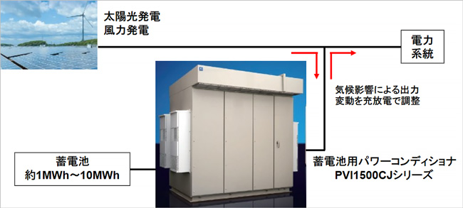従来は、火力発電でその出力変動に対応していましたが、二酸化炭素の排出量削減のため、近年は、火力発電による出力調整に頼らない電力システムが必要になってきました。そこで蓄電池に余剰電力を充電し、不足時に放電する機能を担う、蓄電池を用いたシステムに注目が集まっています。