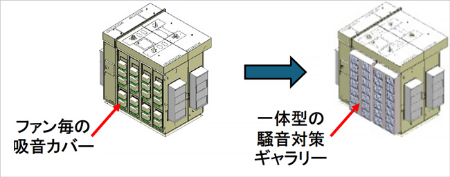 そのため、対策としてファンについている吸音カバーを改良しました。従来はファン毎についていた吸音カバーについて、吸音材を搭載したギャラリー構造のカバーを開発し、ファンによる音圧レベルを10dB低減して80dB程度にすることができました。